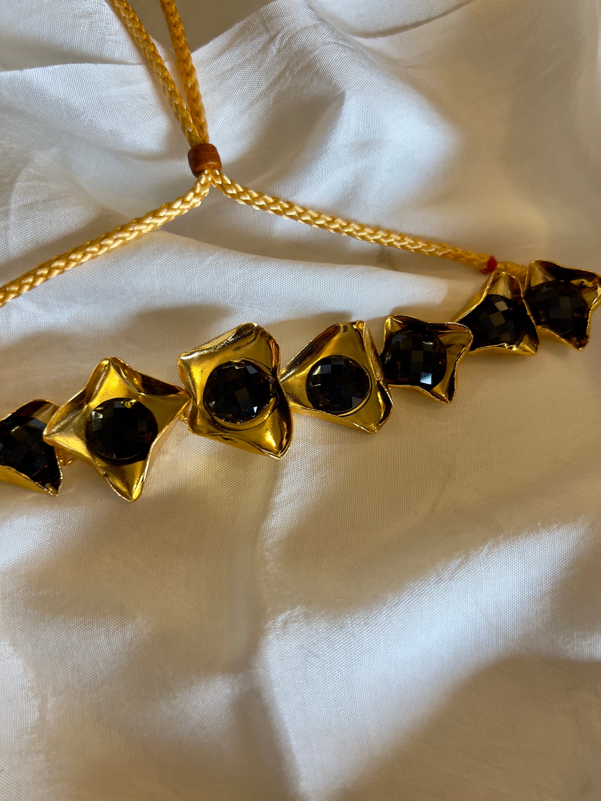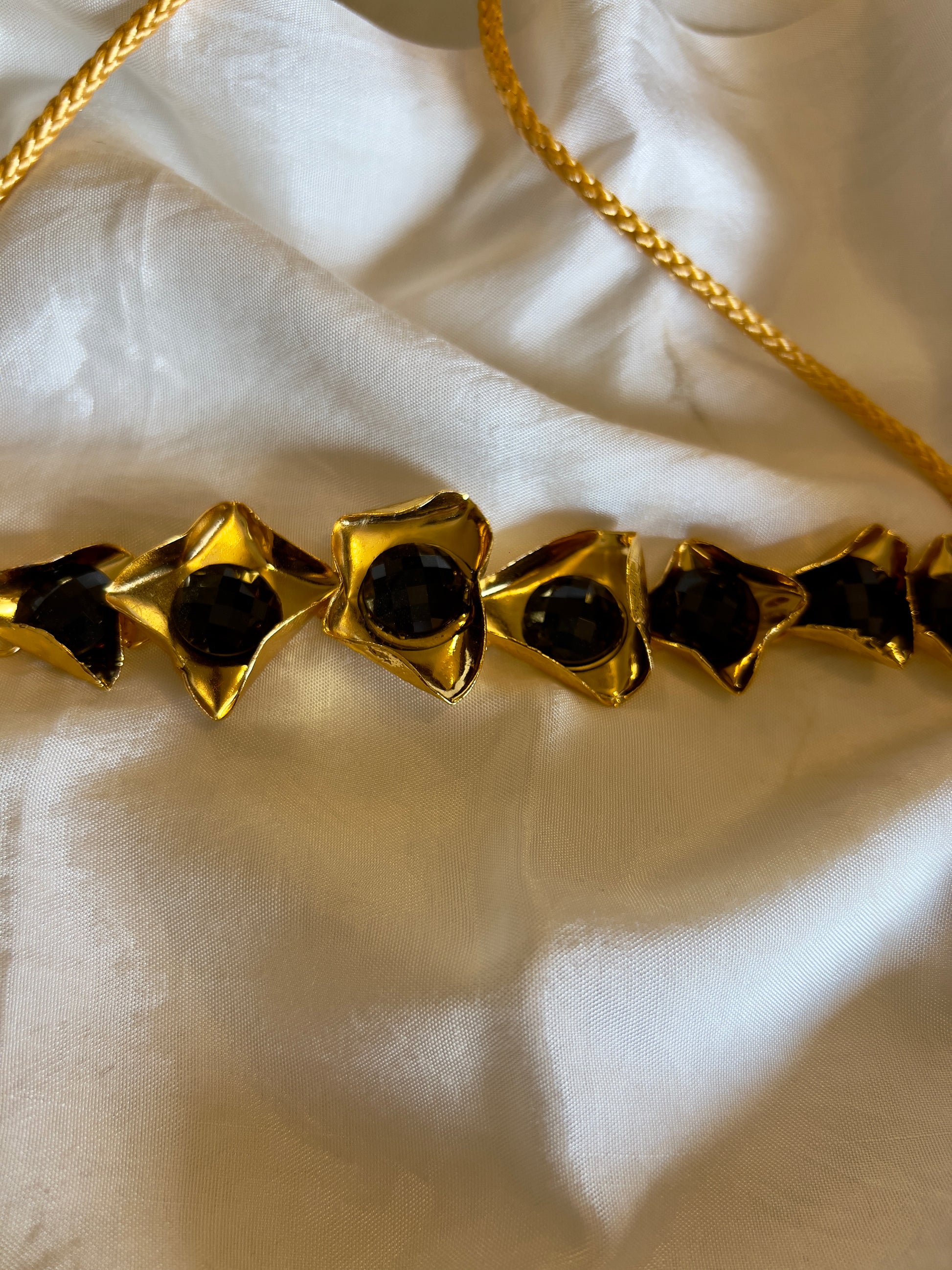 This choker features a unique, irregular design in matte gold, with each shape crafted to create a one-of-a-kind look. The soft matte finish gives it a modern, understated feel, while the uneven shapes add a touch of character and depth. It’s a statement piece that’s still versatile enough for everyday wear, offering a subtle yet edgy vibe. The black accents in the design bring a bit of brightness, creating a perfect contrast to the matte gold. Whether you’re dressing up or keeping it casual, this choker is sure to stand out.