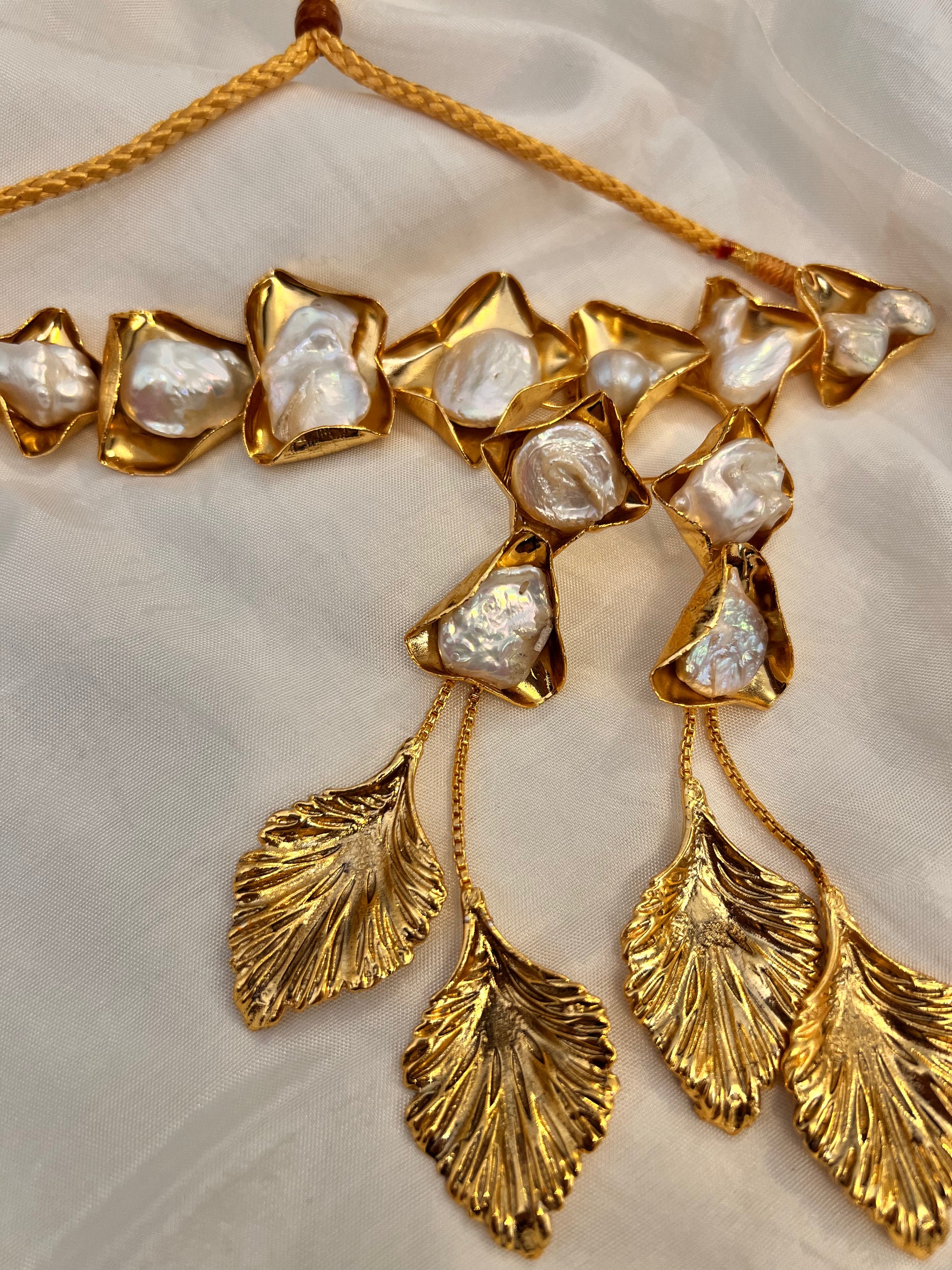 This stunning choker and matching earrings set features an irregular, matte gold design that brings a unique, modern touch to any outfit. The choker sits gracefully around the neck, with each shape carefully crafted to create an organic, one-of-a-kind look. The matte finish gives the piece a soft, sophisticated feel, while the uneven shapes add an edgy yet elegant vibe. Paired with the matching earrings, which echo the same irregular design, this set offers a complete and balanced look. The subtle white accents in both pieces add a touch of lightness, making the gold stand out even more. Whether you're dressing up for a special occasion or adding a unique touch to a casual outfit.